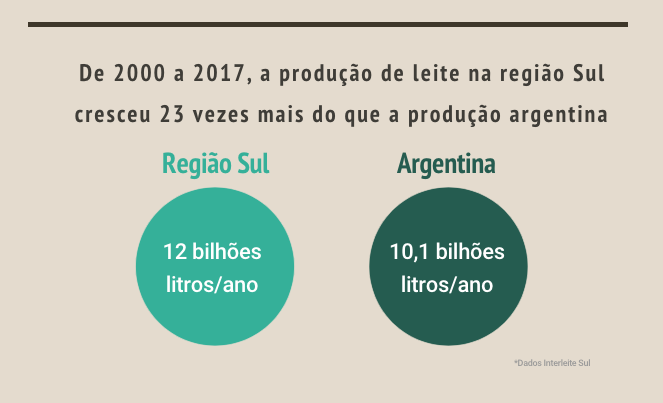 Sim. É verdade. A região Sul do país produz hoje mais leite do que a Argentina. Os dados foram divulgados em março pela organização do simpósio Interleite Sul, antecipando o tema da edição deste ano, que será realizada na cidade de Chapecó, Santa Catarina. Conforme o levantamento, em 17 anos a região Sul cresceu em média 6,0% ao ano, representando quase 52% do acréscimo da produção do País. Quando comparamos com a produção dos nossos hermanos, no mesmo período a Argentina cresceu apenas 303 milhões de litros. Os três estados juntos somaram mais de 7 bilhões de litros, ou seja, 23 vezes mais. Hoje, o Sul produz 12 bilhões de litros/ano, contra 10,1 bilhões da Argentina